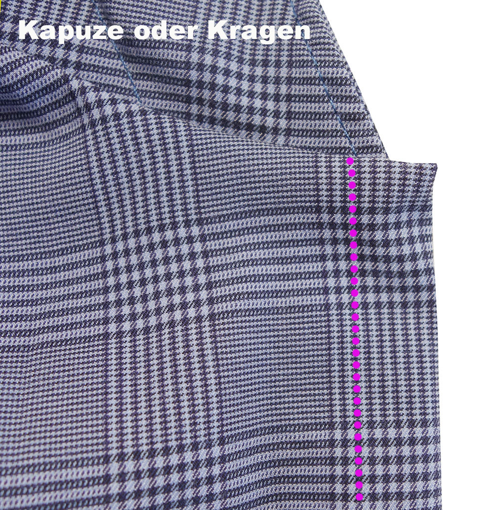 Soll ein Kragen oder eine Kapuze am Halsausschnitt angesetzt werden, diesen erst an den Ausschnitt stecken und dann erst die Knopfleiste darüber klappen. Halsausschnitt nähen. Ggf. noch zusätzlich einen Halsausschnittbeleg (siehe Bild vorher) darüber anordnen.