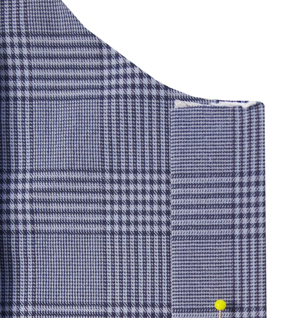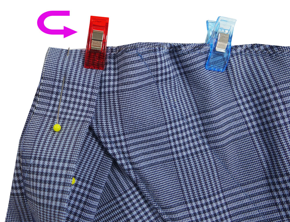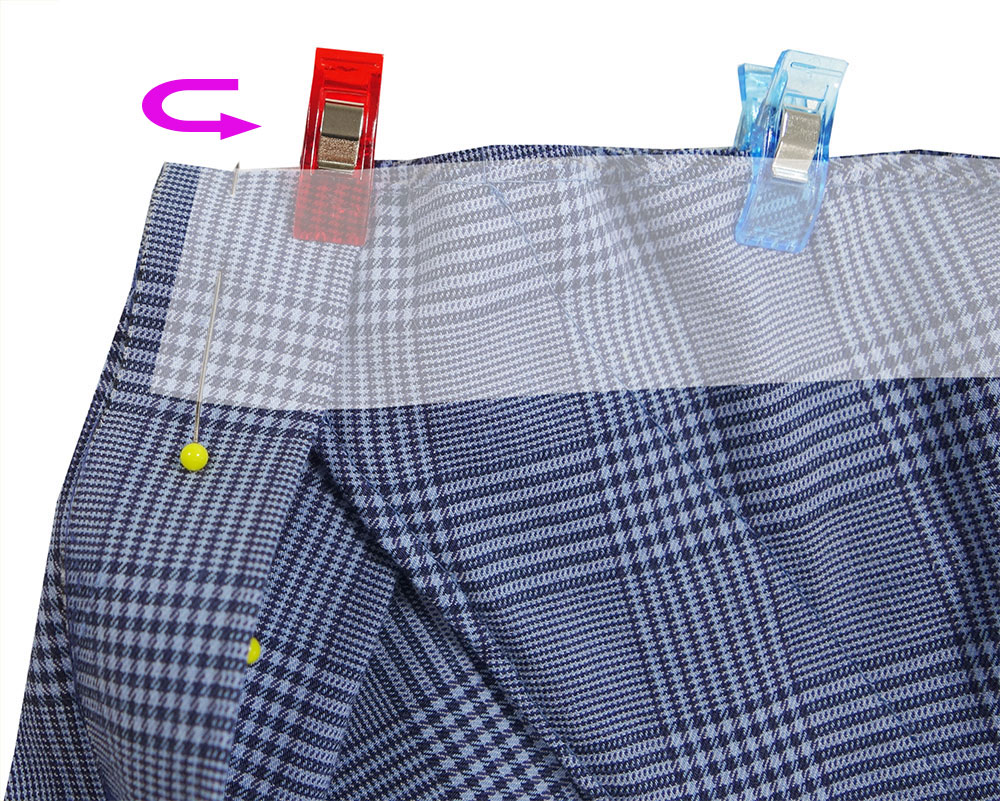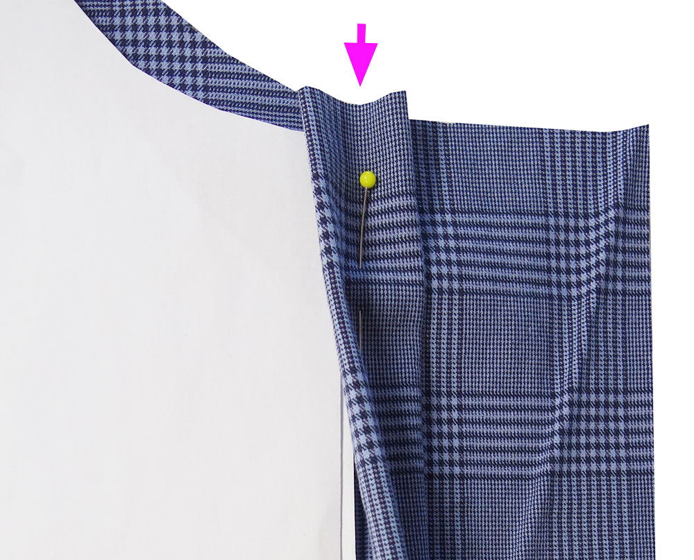 Knopfleiste entlang der zweiten Bügelfalte entgegengesetzt auf die linke Stoffseite klappen und mit einer Stecknadel fixieren. Halsausschnittbeleg entlang des Halsausschnitts anstecken. Er liegt über der Knopfleiste. Beleg am Halsausschnitt annähen.