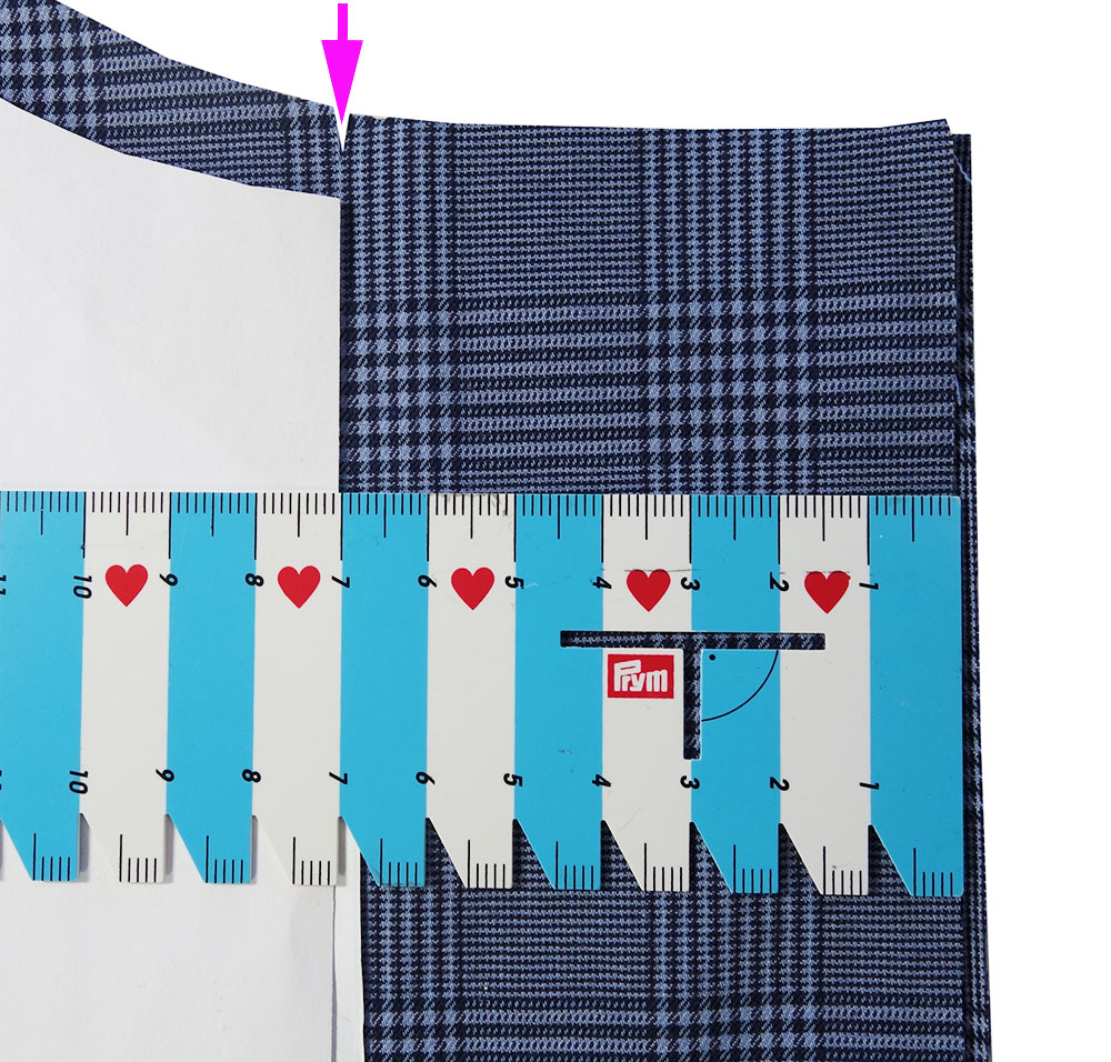 Das Vorderteil nicht im Stoffbruch, sondern geteilt zuschneiden. An der vorderen Mitte für eine 2,5 cm breite Knopfleiste 7 cm hinzugeben. An der ursprünglichen Bruchkante / vorderen Mitte die Nahtzugabe etwas einknipsen.