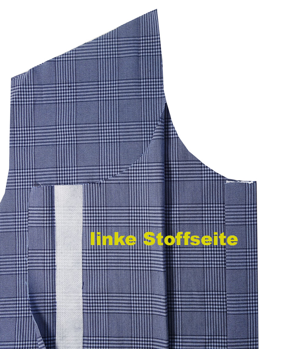 Die offene Vorderkante erst links auf links über den Vlieseline-Streifen klappen und bügeln dann nochmal umklappen und bügeln.
