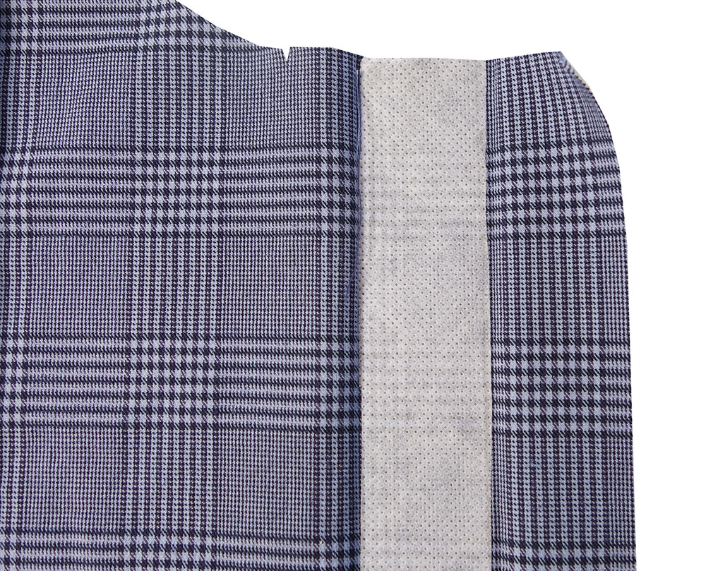 Zwei 3 cm breite Streifen aufbügelbarer Vlieseline zuschneiden und 1,5 cm vom Knips entfernt senkrecht auf die linke Seite beider Vorderteile bügeln.