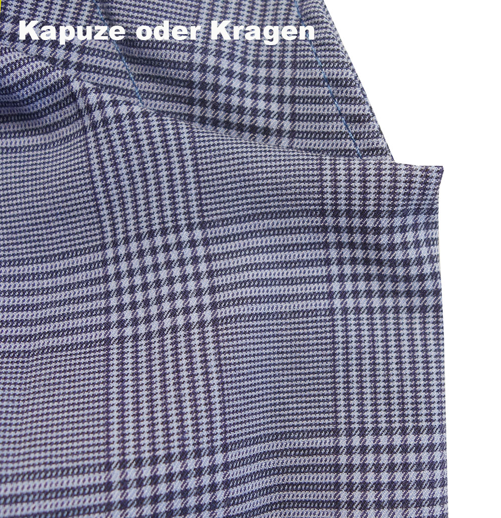 Eine Kapuze / Kragen befindet sich zwischen Bluse und Knopfleiste.