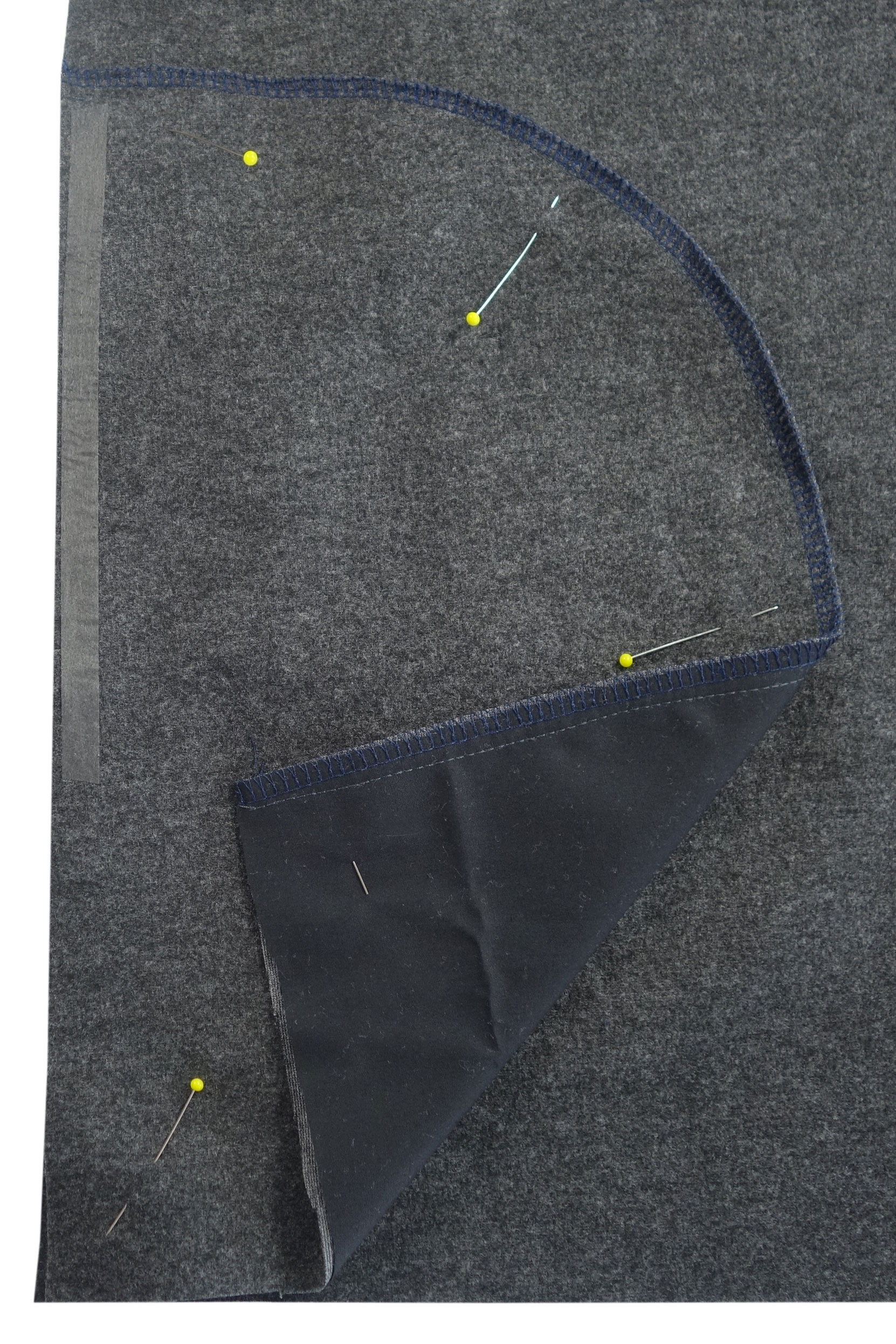 - Nehme ein großzügiges Rechteck deines Futterstoffes und lege ihn rechts auf rechts auf ein Vorderteil.