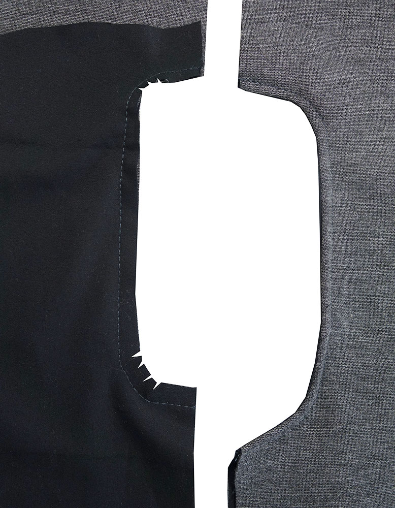 Taschenbeutel aus Webware rechts auf rechts auf den Außenstoff stecken und am Eingriff entlang nähen. Nahtzugabe einkürzen und an den Rundungen einknipsen. Taschenbeutel nach innen wenden und absteppen.